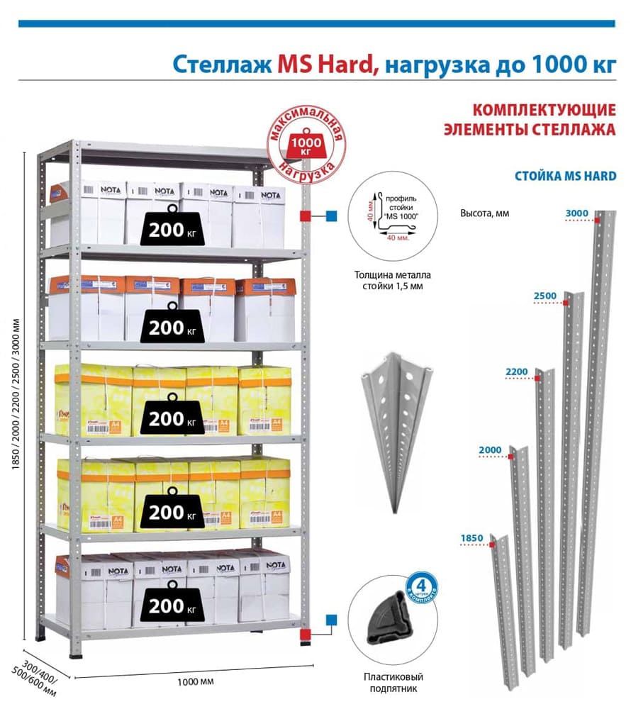 Стеллаж MS Hard 300/100x60Артикул: 35531-1Артикул: 35531-2Артикул: 35531-3Артикул: 35531-4Варианты: 5 полок6 полок7 полок8 полокОсновной склад: Нет в наличииСклад Москва: Нет в наличииОсновной склад: Нет в наличииСклад Москва: Нет в наличииОсновной склад: Нет в наличииСклад Москва: Нет в наличииОсновной склад: Нет в наличииСклад Москва: Нет в наличии 16 890 Р 10 750 РЭкономия: 6 140 Р Стеллаж MS Hard 300/100x60 теперь в вашей корзине покупок ОписаниеХарактеристикиОтзывыДокументацияДоставкаОплатаОписание Стеллаж MS Hard 300/100x60 Металлические стеллажи для склада и мастерских Металлические стеллажи MS Hard могут использоваться в различных сферах деятельности как в офисном или производственном пространстве, так и на складах или мастерских. Применение стеллажей не ограничивается нашими рекомендациями и зависит от поставленных целей и нужд заказчика. Нажмите, чтобы увеличить картинку Особенности стеллажей серии MS Hard: Стойки MS Hard: усиленный угловой профиль сложного сечения 40х40 мм; толщина стали 1,5 мм; два вида усилителя стоек: Г-образный (сборка с использованием болтов и гаек), и Т-образный (сборка без гаек). Полки MS Hard: равномерно распределенная нагрузка на полку – 200 кг; высота бокового ребра полки – 33 мм; шаг регулирования высоты полок – 25 мм; толщина основания 0,7 мм. Стеллаж MS Hard: максимальная нагрузка – 1000 кг; два вида подпятников: пластиковые или регулируемые металлические (при установке регулируемых подпятников нагрузка снижается до 400 кг и увеличение грузоподъемности за счет использования усилителей невозможно); цвет: серый полуматовый (RAL 7038). Стандартная комплектация: Стойка MS Hard 300 – 4 шт. Полка MS Hard 100x60 – выбранное количество Крепеж стойки MS Hard (уголки 4 шт) – 6 шт. Дополнительные аксессуары для стеллажа: Нажмите на картинку, чтобы посмотреть все дополнительные аксессуары для стеллажаХарактеристики Внешние размеры (ВхШхГ)3000 × 1000 × 600 мм Нагрузка на стеллаж, кг1000 Макс. нагрузка на полку, кг200 Кол-во полок5, 6, 7, 8 Толщина металла стойки, мм1 Толщина металла полки, мм0.7 Шаг перфорации стойки, мм25 Креплениена болтах Покрытиепорошковое Вес стоек (4 шт.) без полок, кг16 Вес одной полки, кг6 Гарантия1 год ПроизводительПРОМЕТ (Россия) Отзывы посетителей(0)Оставьте отзыв об этом товаре первым!ДокументацияДоставкаТранспортировка товара с Основного склада до адреса в Домодедово или ПВЗ (пункта выдачи заказов) осуществляется в течение 1-5 рабочих дней после оформления заказа и его оплаты. Варианты доставки: Доставка до адреса Самовывоз из ПВЗ (пункта выдачи заказов) Стоимость транспортировки зависит от заказа (объем, вес) — её можно уточнить у менеджера по тел.: Порядок получения заказаПри получении заказа рекомендуется распаковать товар и сверить с заказом. После получения и проверки заказа необходимо ознакомиться с документами и подписать их.После подписания акта приёма-передачи претензии по комплектации не принимаются. Доставка по всей РоссииМы можем отправить товар в любой город России транспортными компаниями. Склады расположены в 34 городах страны. Наши менеджеры могут подобрать самый оптимальный вариант доставки до Вашего города. Мы работаем с любыми транспортными компаниями, с которыми Вам удобнее работать. Наши менеджеры самостоятельно рассчитывают стоимость во многих крупных транспортных компаниях и предлагают клиентам более быстрый и недорогой способ доставки. Чаще вс